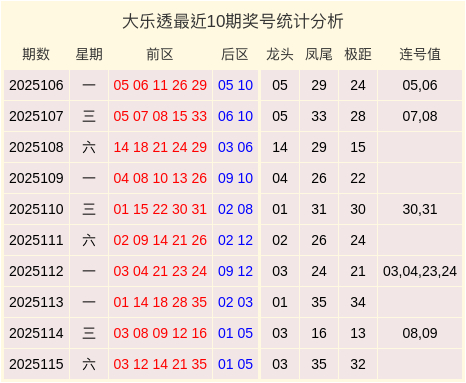 后区分析:近十期后区奖号的大小比为8:12,上一期开出小小数01、05,本期关注后区开出小大数02、10。