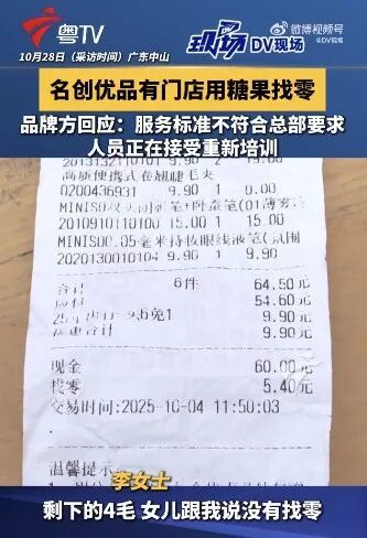 广东中山的李女士反映,她的女儿经常去当地一家名创优品买东西,每次都用现金结账,但店员找零却用糖果找零。